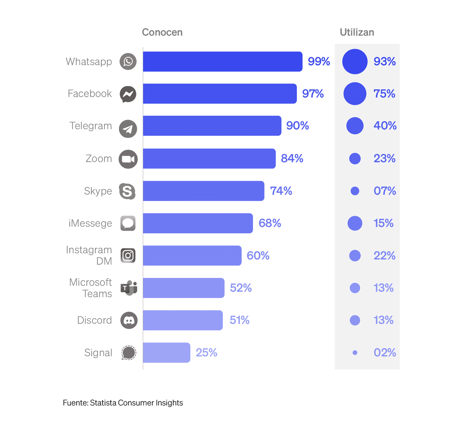 Porcentaje de encuestados que conocen y utilizan los siguientes servicios de mensajería. WhatsApp es el servicio de mensajería más popular en México, con un 99% de reconocimiento y un 93% de uso entre los usuarios encuestados, seguido por Facebook Messenger, con un 75% de uso.